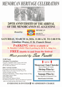 The Menorcan Cultural Society welcomes anyone who is of Menorcan ancestry or is interested in supporting Menorcan culture and history. We are involved in a number of activities throughout the year which are listed on the Events page. If you are interested in membership, please print out the form, fill it out and mail it to The Menorcan Cultural Society, P.O. Box 3565 St. Augustine, FL 32085